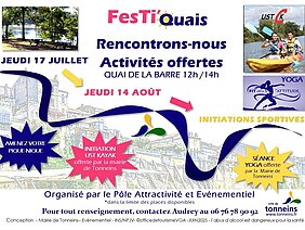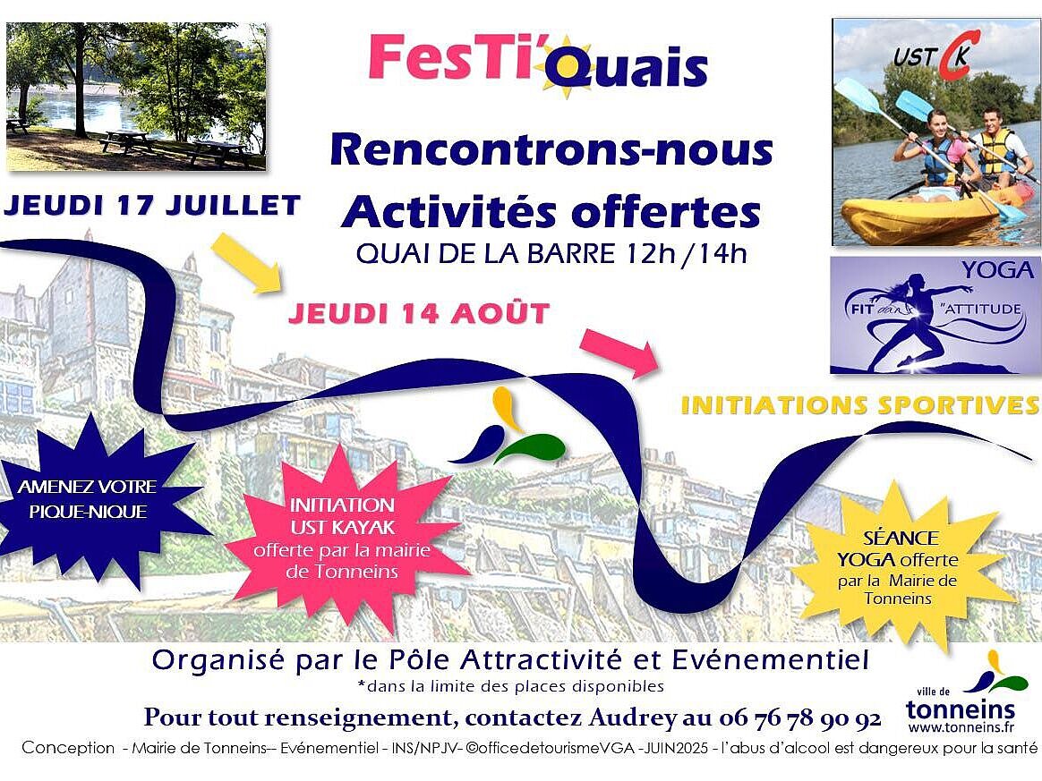 À ne pas manquer au quai de la Barre. Jeudi 17 Juillet, 12h - 14h. INITIATIONS SPORTIVES GRATUITES de 30 minutes offertes par la Ville de Tonneins. Profitez d'une pause déjeuner sportive ou relax au QUAI DE LA BARRE ! YOGA ou KAYAC