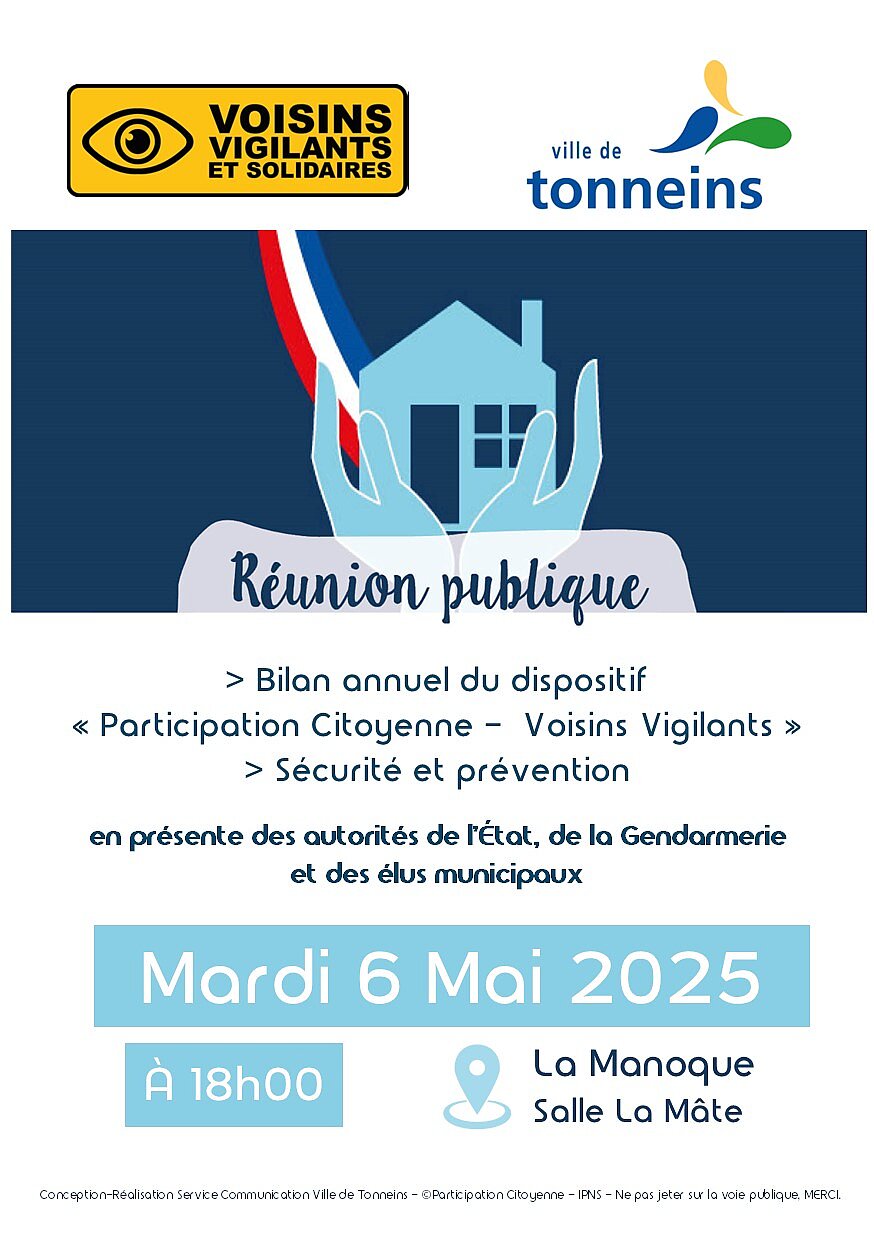 La Ville de Tonneins organise une réunion publique le mardi 6 Mai 2025 à 18h à La Manoque. Elle sera dédiée au dispositif "Participation citoyenne - Voisins vigilants" et à la sécurité et prévention.