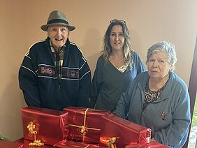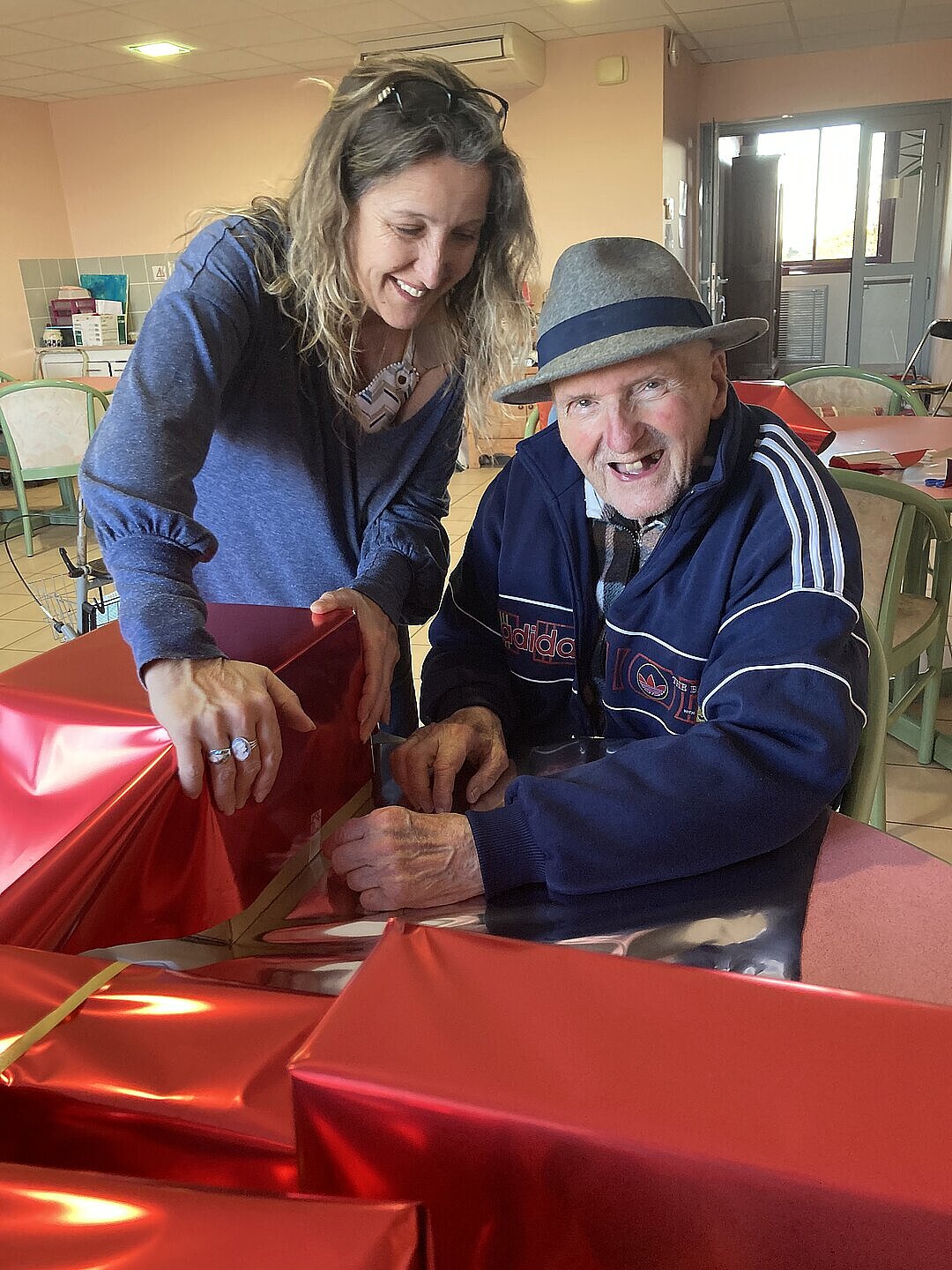 Nous partageons deux photos où nous voyons Benoît et Denise, résidents de l'EHPAD Soleil d'Automne, et Christine, animatrice de l'établissement Tonneinquais, entrain de confectionner les cadeaux destinés à la décoration de la commune pour les fêtes de Noël.
