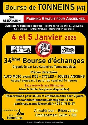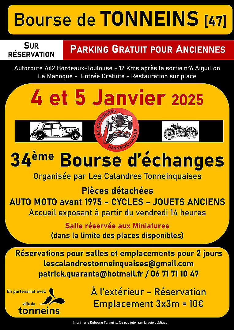 La Ville de Tonneins accueillera les 4 et 5 Janvier une nouvelle édition de la Bourse d'Échanges des Calandres Tonneinquaises, en partenariat avec la Ville de Tonneins. Jusqu'à 2023 elle se déroulait à Damazan. Une quarantaine de départements seront représentés, une cinquantaine d'exposants pour les miniatures et 180 exposants en extérieurs. 50 bénévoles des Calandres, sur 165 adhérents, apporteront leur grain de sable.