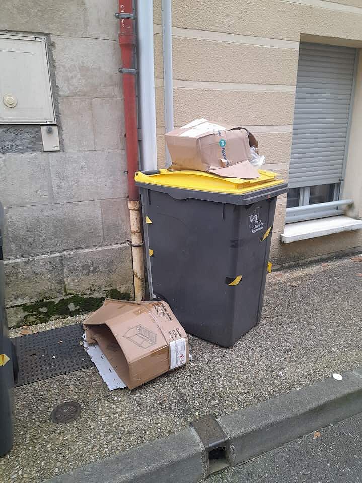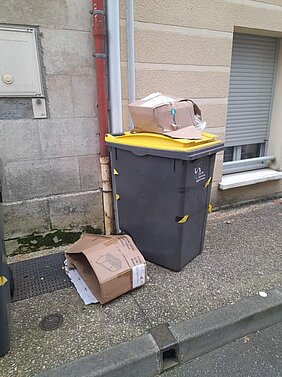 Photo 02 : Même motif même sanction pour ces cartons. De même les bacs n'ont rien à faire dehors et doivent être rentrés en dehors des jours de collecte. Les bacs laissés dehors sont propices aux dépôts sauvages.