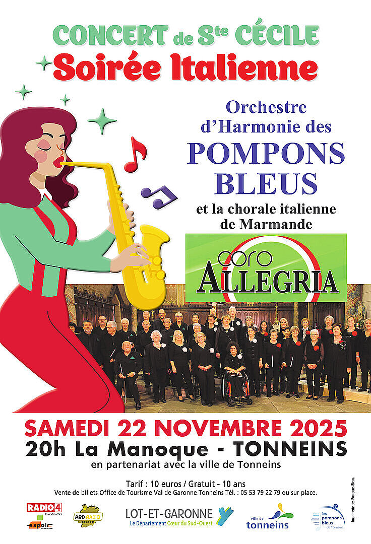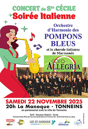 Notez bien la date ! Cette année, le concert sera dédié à l'Italie avec, comme invitée, la chorale italienne de Marmande (Coro Allegria). Et, bien entendu, l'Orchestre d'Harmonie des Pompons Bleus.