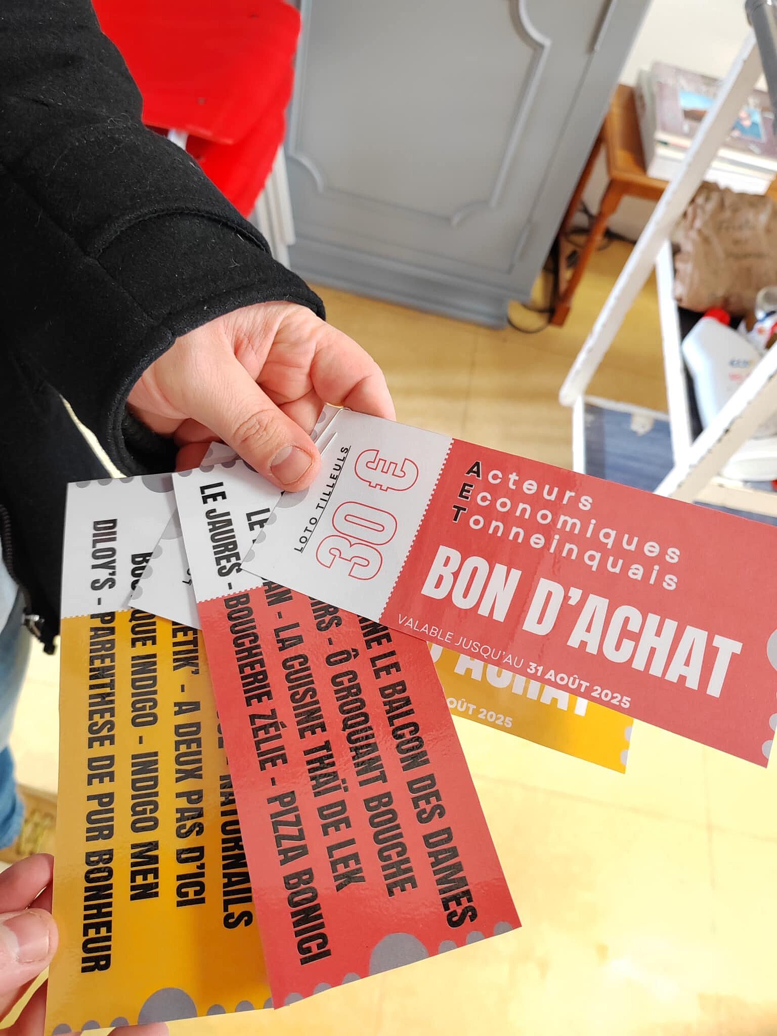 1 carton plein offert par le CCAS et deux cartons pleins d'une valeur de 30€ chacun offerts par les AET - Acteurs Économiques Tonneinquais.