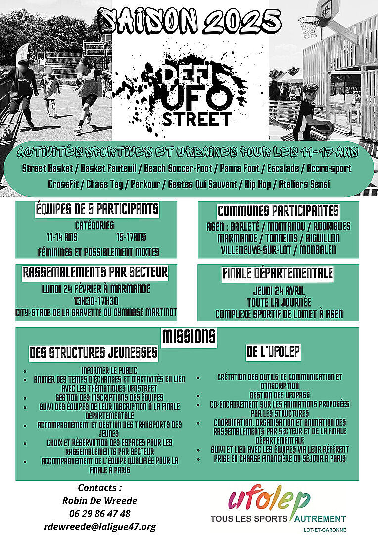 L’UFOLEP 47, en lien avec le comité national, propose aux jeunes âgés de 11 à 17 ans de participer à un dispositif intitulé UFOSTREET. L’objectif pour les jeunes est de former des équipes de 5 participants (100% féminines ou possiblement mixtes) en vue de répondre présent au rassemblement de secteur qui aura lieu à Marmande le lundi 24 février après-midi puis de participer à la finale départementale à Agen le jeudi 24 avril sur une journée entière. Ces évènements leur permettront de découvrir une multitude d’activités sportives et/ou de culture urbaine tout en étant sensibiliser à certaines thématiques (secourisme, discrimination, violences).