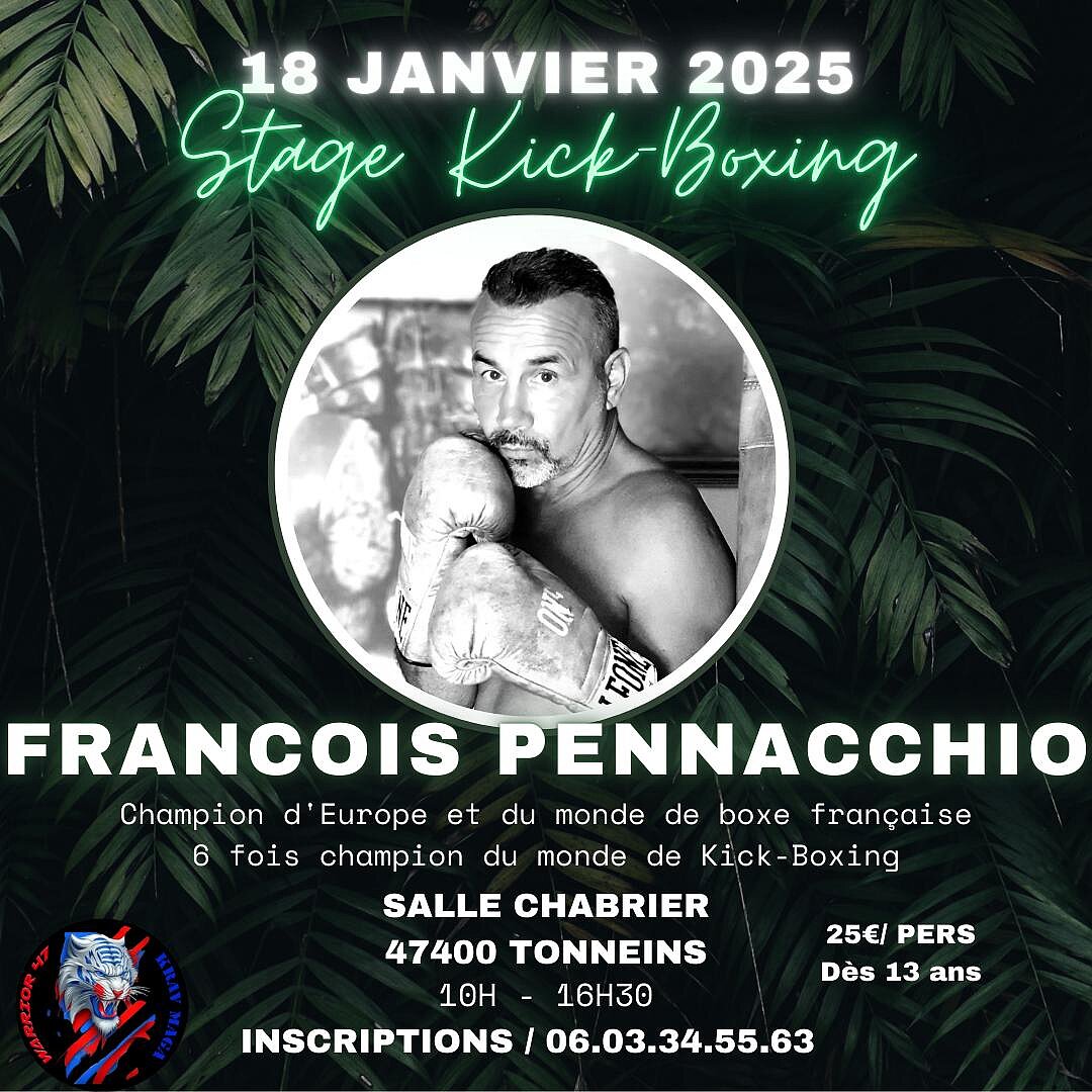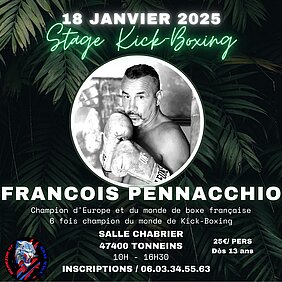 Michael Aslanian organise à la salle Chabrier le samedi 18 Janvier 2025 de 10h à 16h30 un grand stage de Kick-Boxing avec François Pennacchio, six fois Champion d'Europe et du Monde, qui sera avec nous pour dispenser un stage ouvert à tous : débutants, initiés et confirmés, et à tout style de combats.